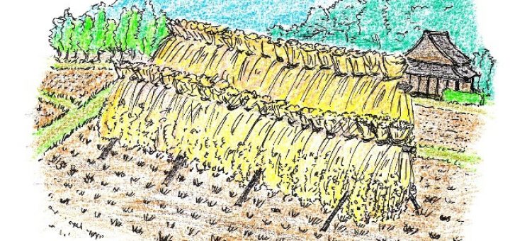 En Automne, au Japon, c’est la récolte du riz. Après l’avoir ramassé, on le fait sécher ainsi (du moins traditionnellement). Ça fait des paravents de riz dans les champs.