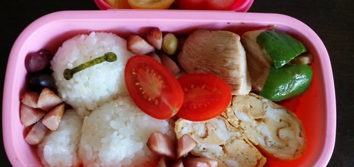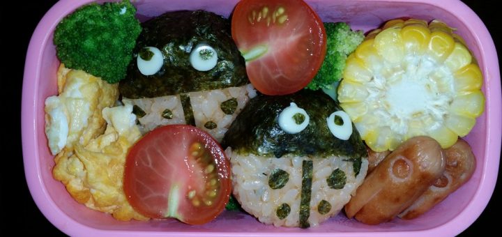 Au menu : broccoli, omelette, tomates, maïs, onigiri coccinelles, saucisses pieuvres.